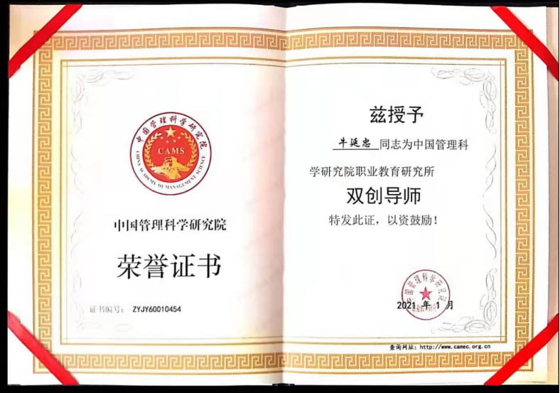 2021年1月,中國管理科學(xué)研究院授予精中公司執(zhí)行董事兼總經(jīng)理牛延忠先生“雙創(chuàng)導(dǎo)師”榮譽(yù)稱號,以表彰其在“大眾創(chuàng)業(yè)、萬眾創(chuàng)新”中所做出的突出貢獻(xiàn)。
